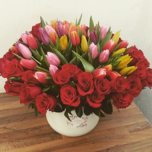 Magnífico arreglo de tulipanes y rosas, sin duda un detalle precioso con el que crearás un ambiente más colorido y cariñoso.