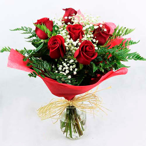 Ramo de 6 Rosas de tallo largo con paniculada y helecho
